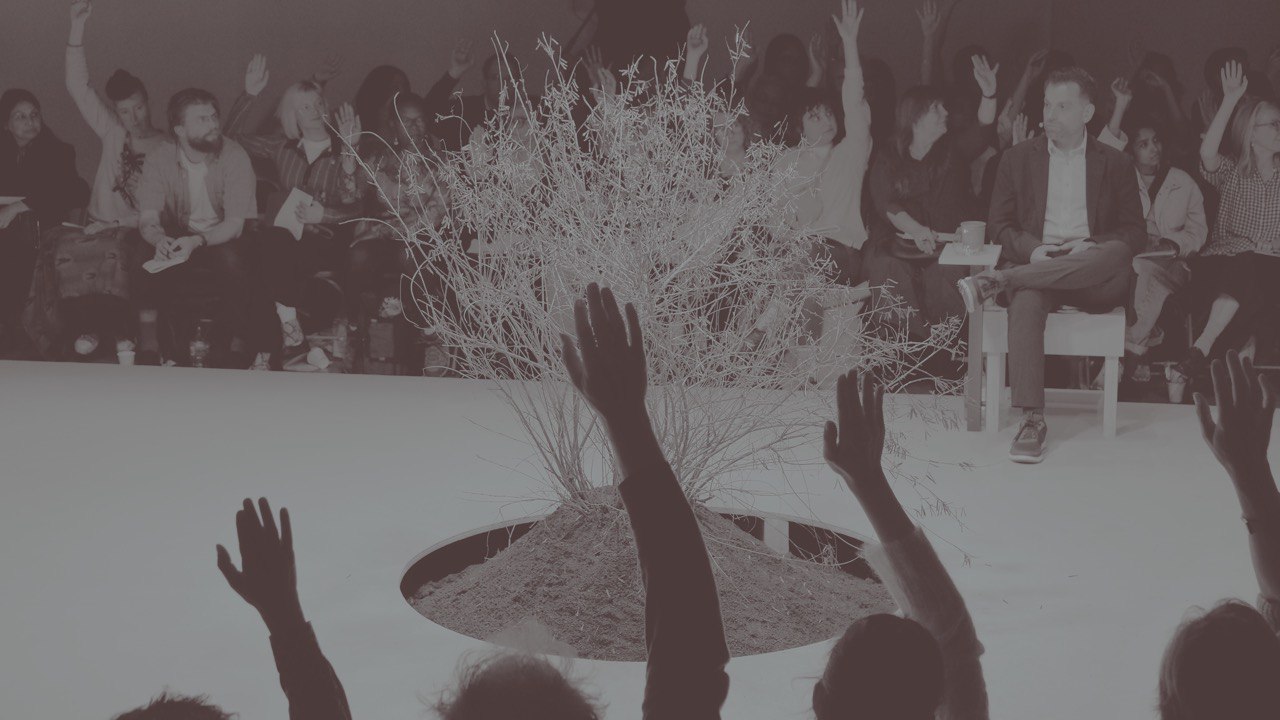 Conceived by law professor Radha D’Souza and artist Jonas Staal, the CICC examines historical and current climate as well as colonial crimes in the context of public hearings, as part of an ongoing series that has addressed different cases and contexts in the past, with hearings in Amsterdam in 2021 and Gwangju in 2023. This format combines political tribunal and artistic assembly with an immersive spatial staging that at Ambika P3 was centered around a triangle-shaped yellow stage. At its core stood a bush – ‘Comrade Indigo’ – framed by displays of plants – ancestors who remain in captivity in the British East India Company botanical archive at Kew Gardens, London – and tightly arranged seating that brought the audience into close proximity with the proceedings. The CICC also sees itself as a new approach to jurisdiction that takes into account both human and non-human life and considers negotiations about the past, present and future simultaneously.
