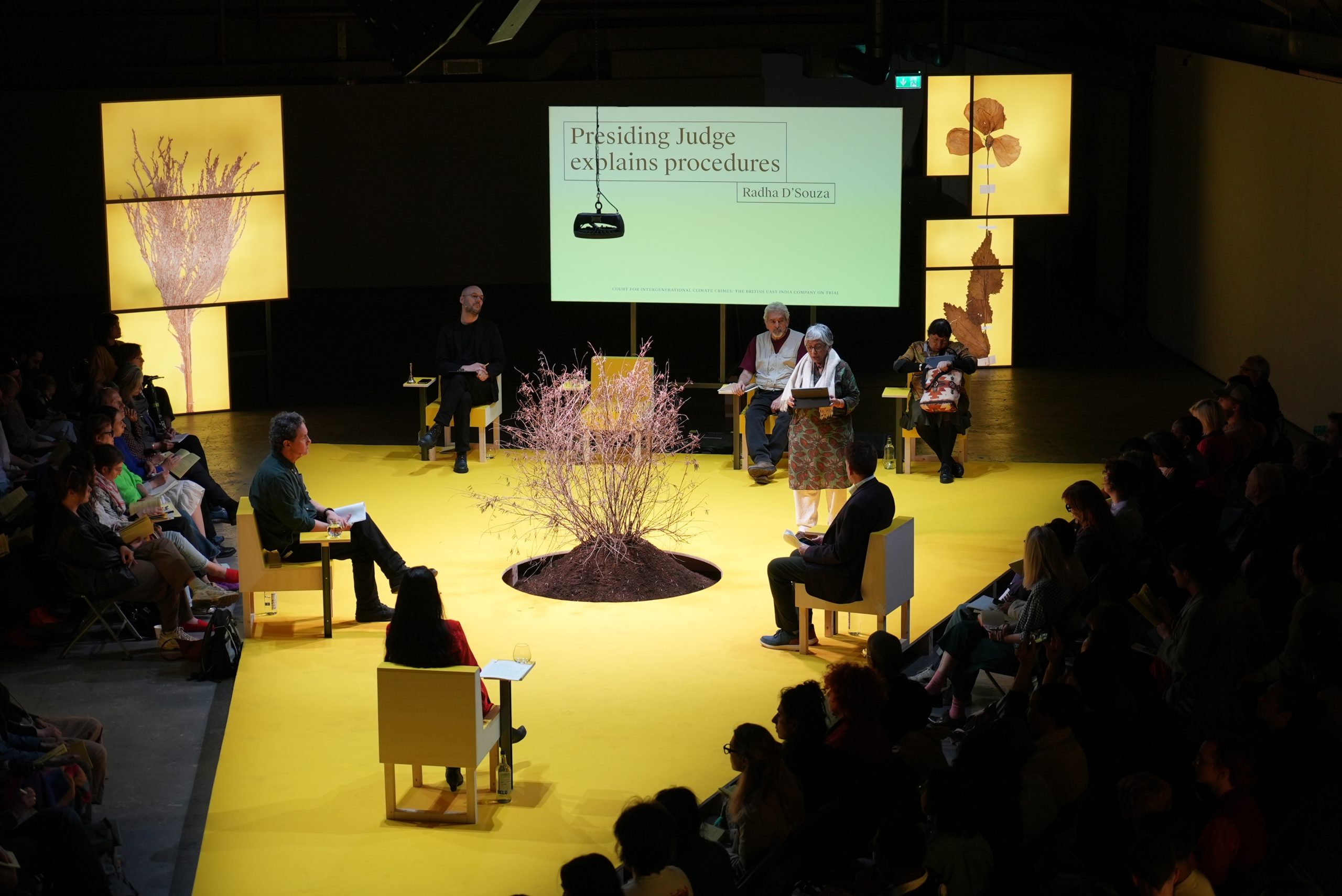 As a point of departure, Pedro Urano’s ‘The leaves are coming out’ relates a brief poetic encounter with the indigo plant growing at the centre of the CICC’s court for the duration of the project. Referred to throughout proceedings as Comrade Indigo, the plant’s presence as a more-than-human witness is a topic that several contributors to this issue address. This is the case with Natalie Kynigopoulou’s account of Case I of the CICC, ‘Entangled Futures- Revolving Celluloses and Seeds of Hope’, in which the indigo plant sprouts seeds of hope for rooted, symbiotic, entangled futures. The text also reflects on the East India Company’s role in instigating long histories of corporate-state collusion that continue to this day, as well as the role of the Public Jury in the CICC as a form of communitarian assembly.
