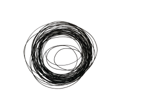 At the end of the CICC trial, I sit in my seat in Ambika P3 and watch as the Public Jury, Prosecutors, Witnesses and Judges pick up their belongings and gather to talk. Many of them collect on the yellow stage, by the indigo. I sit inside this moment with my focus lightly on the centre of the room, and I do what I’d found myself doing a lot while I was there: I start circling. My circling happens on the page, however, with paper and pen. In my case, this circling is a kind of cartography: a means to mimic the motions I have been witnessing in the middle. I had not been doing this intentionally, though. While I listened to the trial and its speakers, my hand seemed to reach to the page without my conscious knowledge. Later, I will wonder if my focus on the circling represents a somewhat anthropocentric, perhaps even pacifying perspective of indigo to have taken, as I wonder whether I’m ignoring the plant by focusing on the motion of the people. But it’s not until a week or so afterwards, when I am walking along a beach with a friend that I am able to make some sense of it. As we talk, my friend picks up a chalk pebble with a hole in it and I tell them that this is called a Hagstone or witch’s pebble, and the folk understanding is that if you look through the hole you see through a veil to the other side: to the spirit realm. It’s a well-storied stone, I say, people sometimes wear them around their neck for protection.