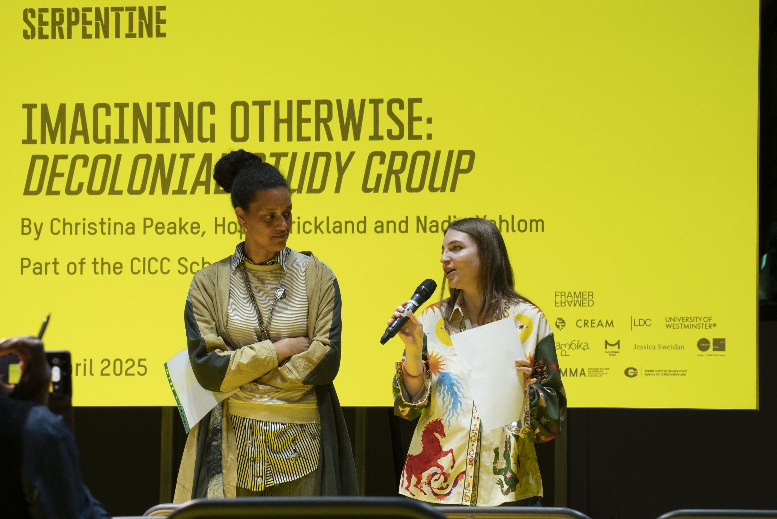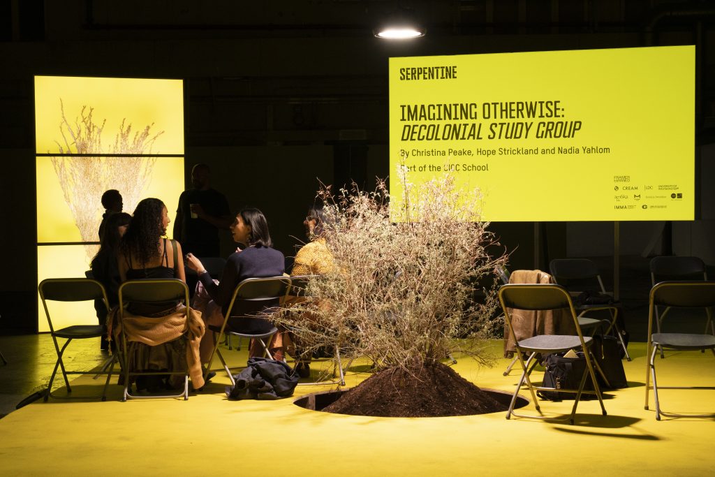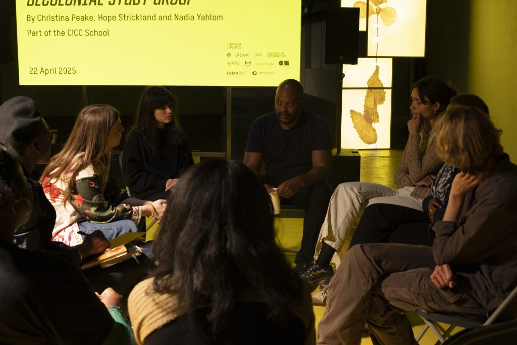 The Imagining Otherwise: Decolonial Study Group workshop took place on the afternoon of 22 April 2025. The event was led by artists and PhD researchers at CREAM, University of Westminster, Christina Peake, Hope Strickland and Nadia Yahlom. It delved into decolonial knowledge on climate activism, aiming to encourage researchers, artists and members of the public to learn from one another through collaborative exchange. The event further developed ways of sharing and discussing the impact of colonialism on intergenerational climate issues through a screening, collective reading and discussion of a range of experimental texts, as well as through a simulation game based on an imaginary island.