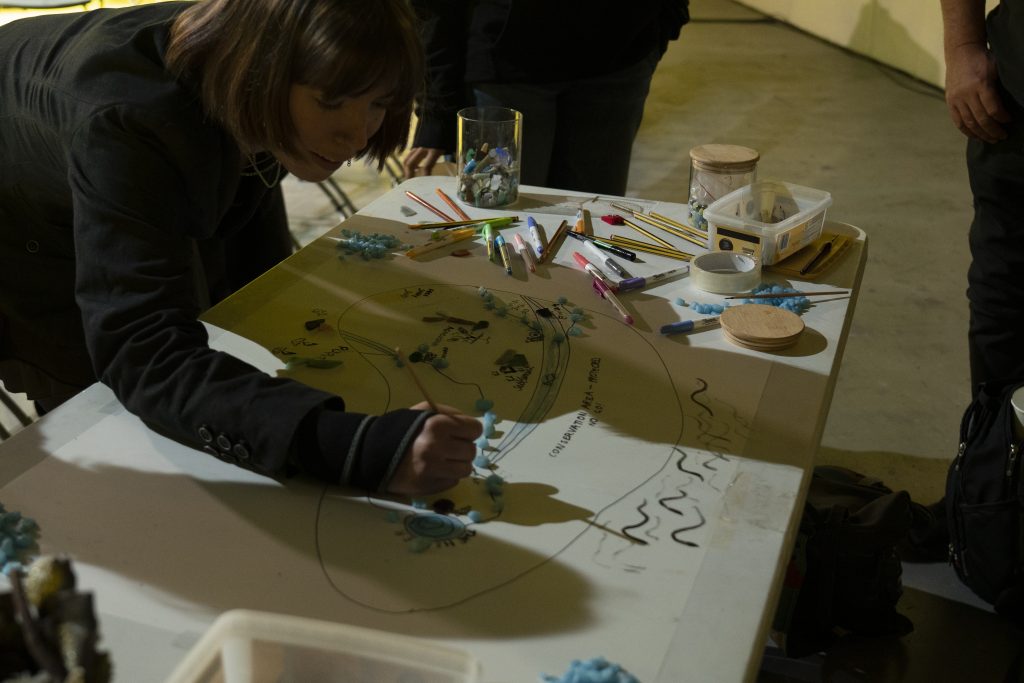 The event was divided into three parts: The first part featured a screening of artist Hope Strickland’s film A River Holds a Perfect Memory (2024), followed by a discussion and exchange centred around the film. In the second part, I participated in a group discussion led by Nadia Yahlom, where we critically examined the current eco-political situation through a series of texts, while another group of participants joined a parallel discussion facilitated by Christina Peake. In the third part of the workshop, led by Christina Peake, participants took on the role of residents of an imaginary island and worked on reimagining and developing the island from an ecological and developmental perspective. After a group of participants constructed their island, another group took on the role of newcomers visiting the island that had just been devised, exploring it as a place for building a potential new home.